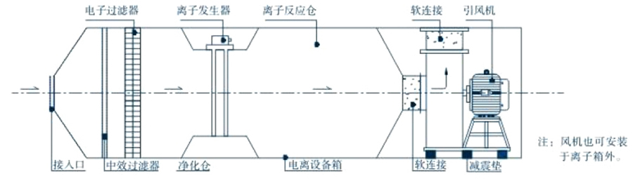 高能離子與空氣中塵埃粒子及固體顆粒碰撞,使顆粒荷電產(chǎn)生聚合作用,形成較大顆粒靠自身重力沉降下來,達(dá)到凈化目的;