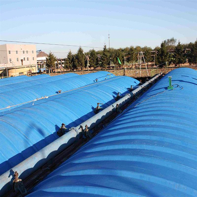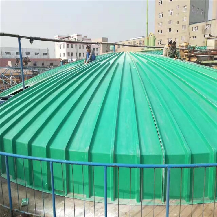 11、為提高產(chǎn)品強度和剛度,根據(jù)用戶需要可設計為拱形,供高根據(jù)池體跨度確定,集氣罩表面設計為波浪形,產(chǎn)品剛性與載荷大幅度提升,達到高強、安全的目的。對于圓形池體可設計為平板護罩,采用傘形布置、立筋加強,并輔以復合框架支撐。